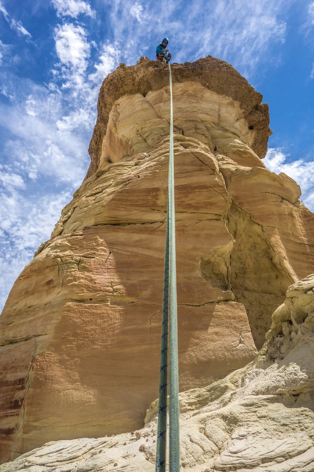 Em leading on Don Juan Spire with Bird's View Butte in the background